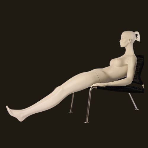 Stilisierte Schaufensterfigur in einer sehr lässig wirkenden, sitzenden Stellung mit gestreckten Beinen.