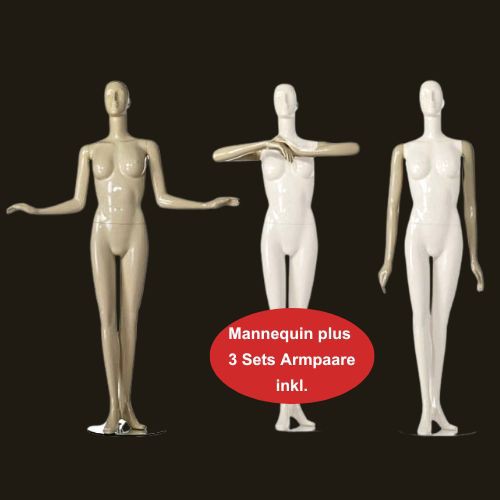 Grazile Damenfigur mit einer puderfarbenen, glänzenden Oberfläche und abstraktem Kopf. Das Mannequin wird mit drei Armpaaren geliefert, was die Figur ungewöhnlich vielseitig macht.