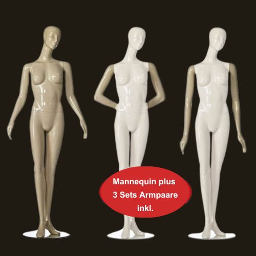 Grazile Damenfigur mit einer puderfarbenen, glänzenden Oberfläche und abstraktem Kopf. Das Mannequin wird mit drei Armpaaren geliefert, was die Figur ungewöhnlich vielseitig macht.