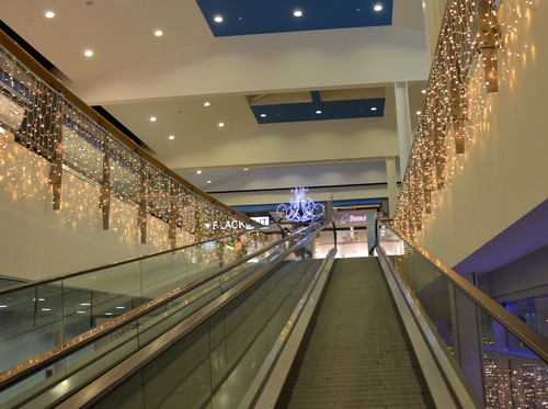 An der Decke hängen speziell angefertigte Kronleuchter mit reinweissem Licht.