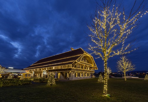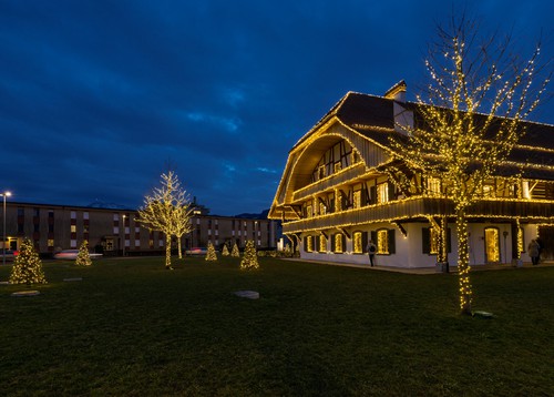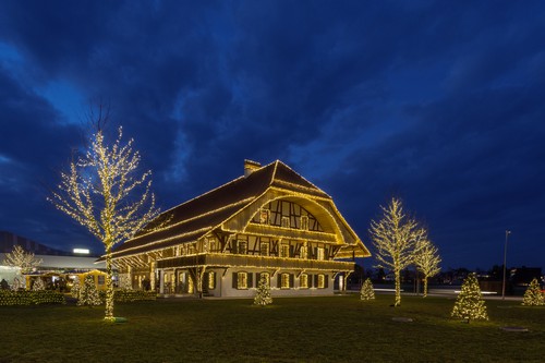 Dachgiebel, Schneefänger, Dackkonturen, Balkon, Holzbalken, Fester und Türen mit LED Lichterketten warmweiss umrandet.