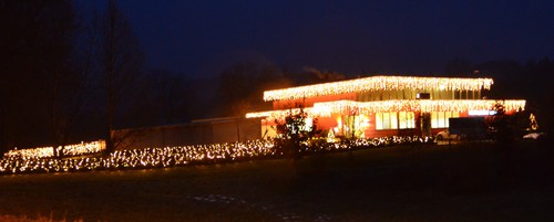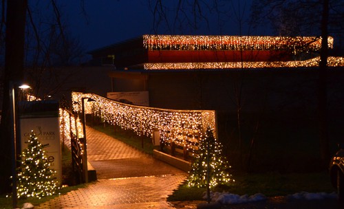 - Dachkante und Brückengeländer sind mit LED Ice Lite geschmückt- Bäumchen und Sträucher mit LED Lichterketten umwickelt